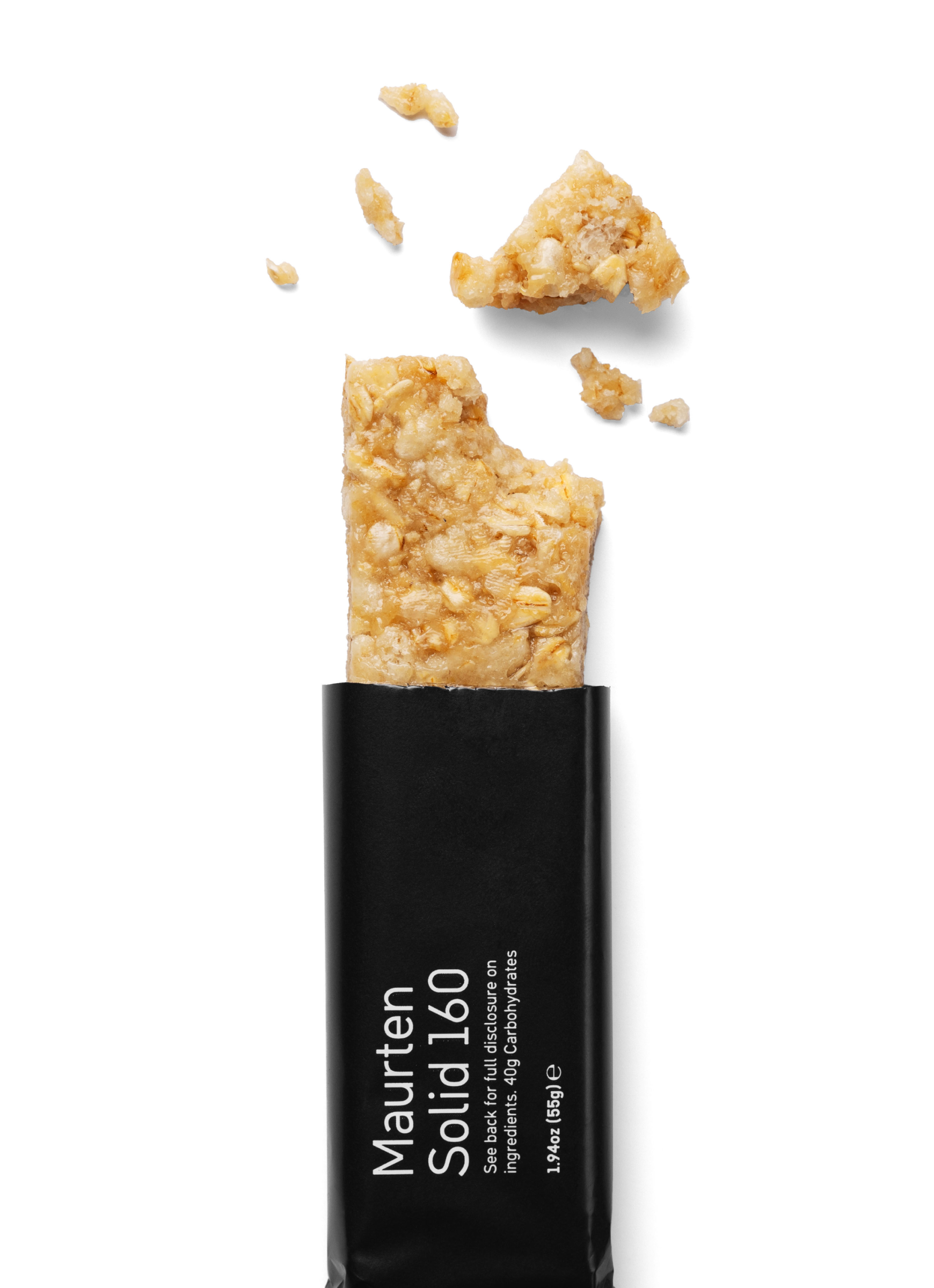 Maurten Solid 160 is a two-piece, oat- and rice-based chewable fuel — 1 pack, 2 mini-bars. 40 grams of carbohydrates split into equal 20-gram servings for optimized fueling. Your go-to fuel — fast, light, low-fiber, and carbohydrate-rich.